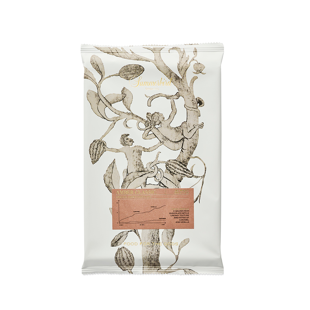 Amber Classic har en sød, karamelliseret og cremet tone, der henleder tankerne på den klassiske franske dessert crème brûlée. Chokoladens komplekse og mangfoldige smag gør den meget populær som både ren spisechokolade og til desserter og bagværk.