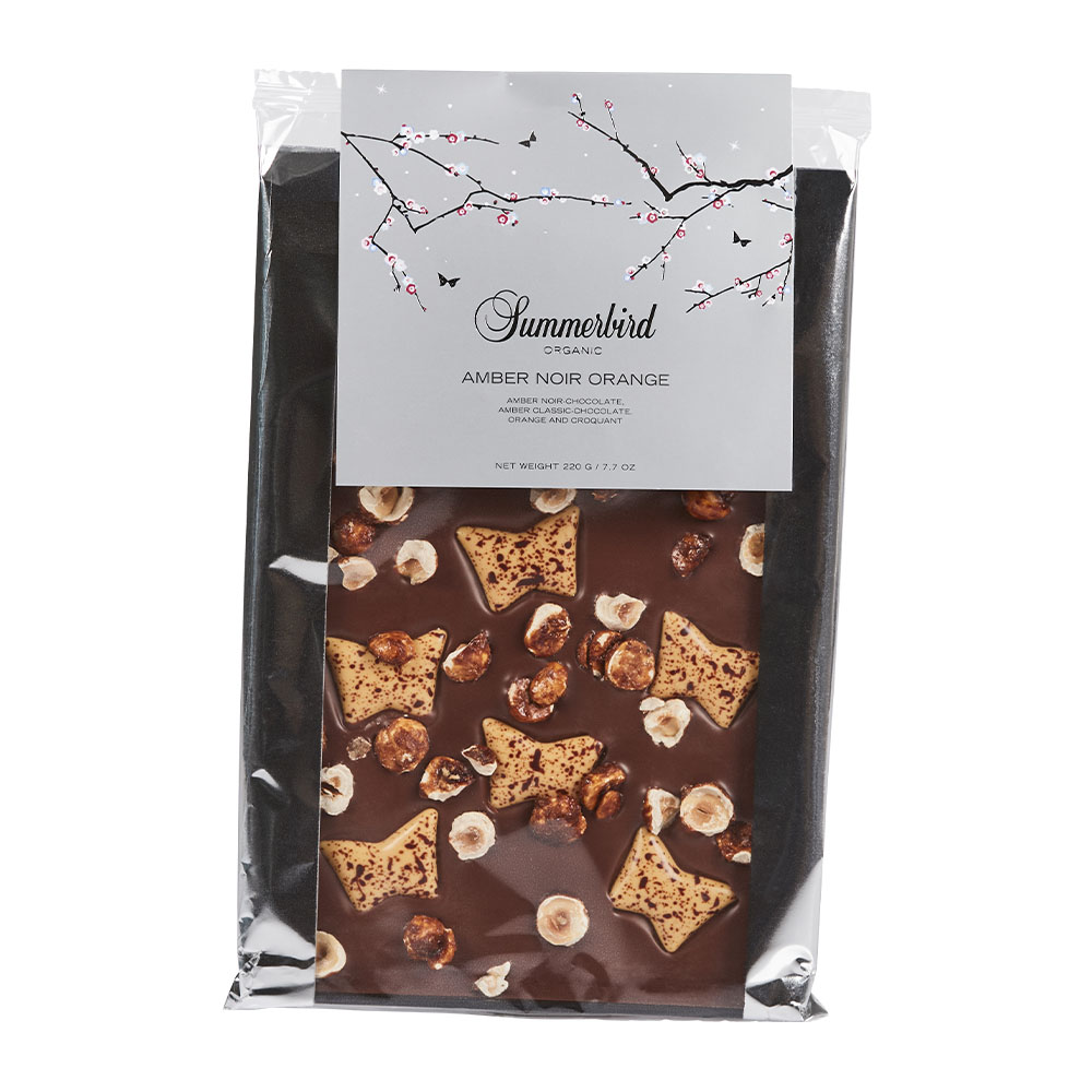 En perfekt og raffineret kombination af 2 af vores mest succesfulde Amber-varianter. Amber Noir-chokolade, forsigtigt tilsmagt med orange, og herefter rundhåndet dekoreret med sommerfugle af vores prisvindende Amber Classic-chokolade og krokant af Piemonte-hasselnødder. En oplevelse for alle, som sætter pris på gastronomi, tekstur og håndværk.
