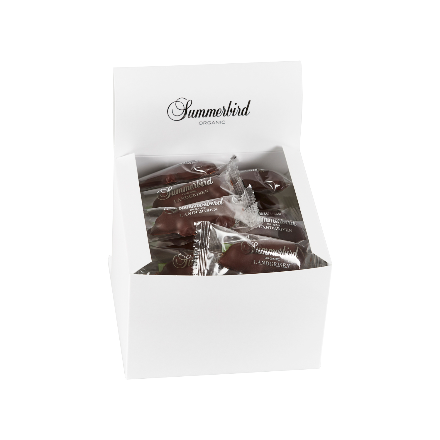 Klassisk miniature-landgris af marcipan, lavet på stenvalsede middelhavsmandler, overtrukket med et lag mørk chokolade Amazonas 61 %.