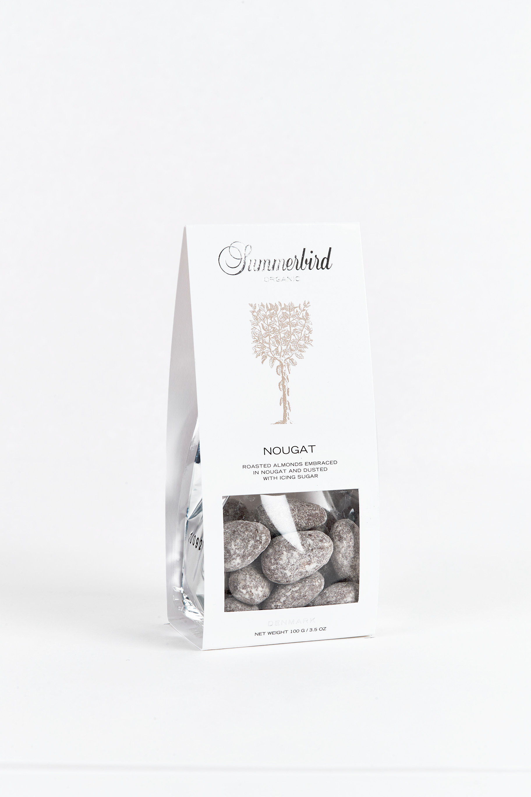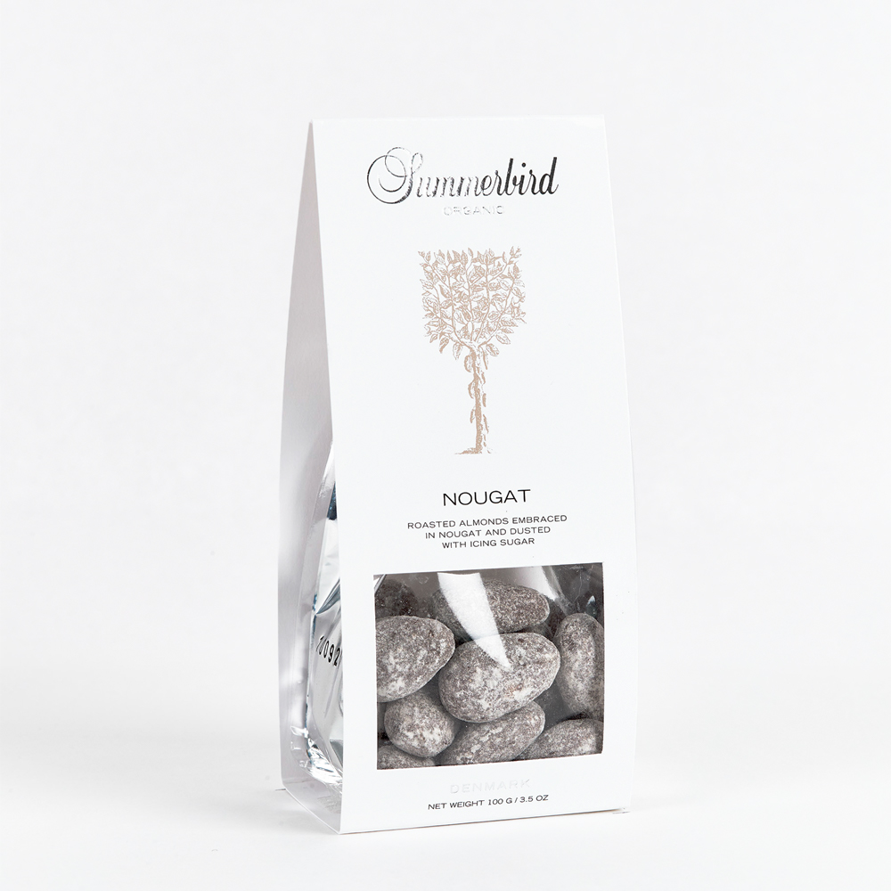 Let ristede spanske mandler, drageret med et tyndt lag nougat og mælkechokolade og afslutningsvis vendt i fnuglet florsukker.