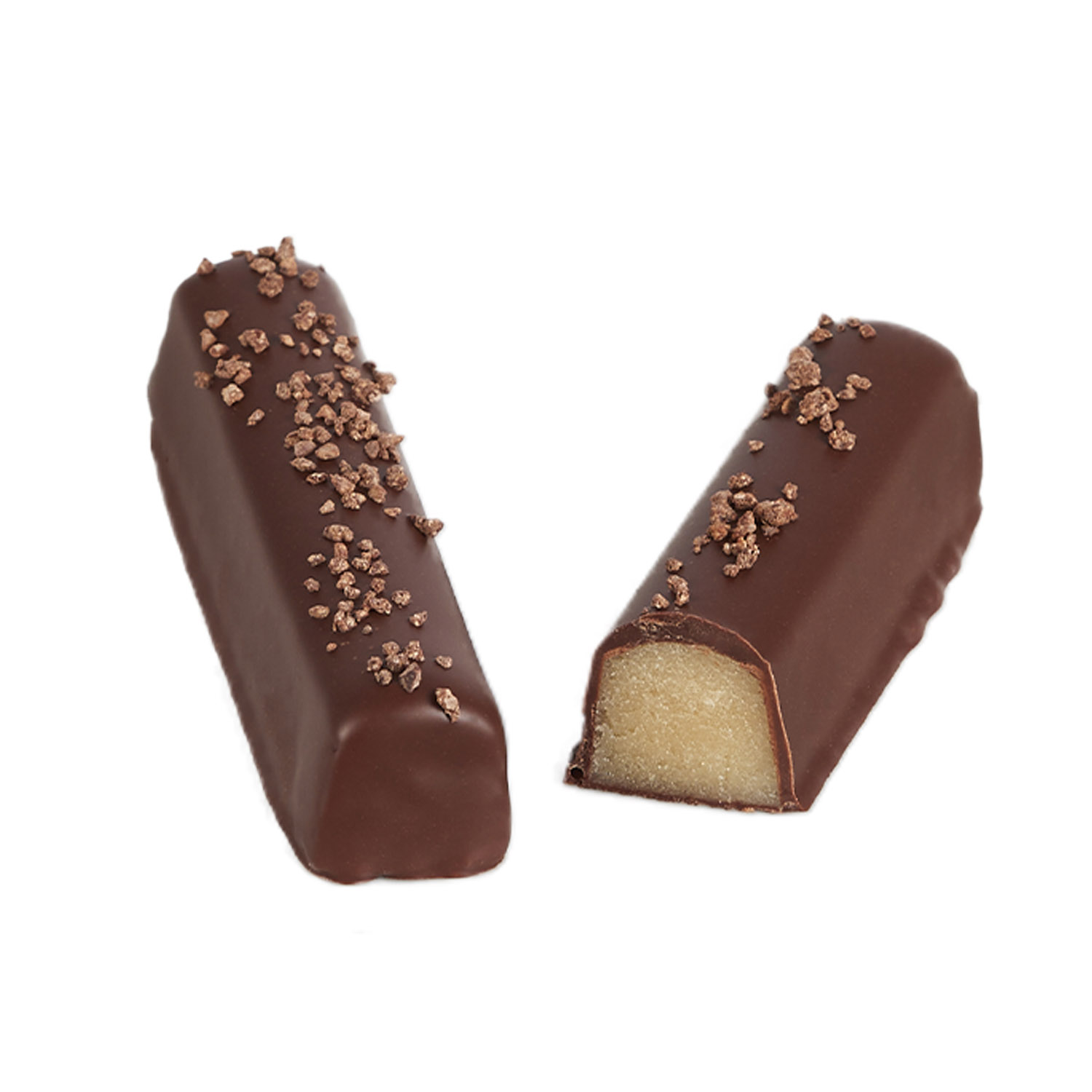 Marcipanbrød på stenvalsede middelhavsmandler, overtrukket med et tykt lag mørkt chokolade Amazonas 61% og afslutningsvist dekoreret med grué.