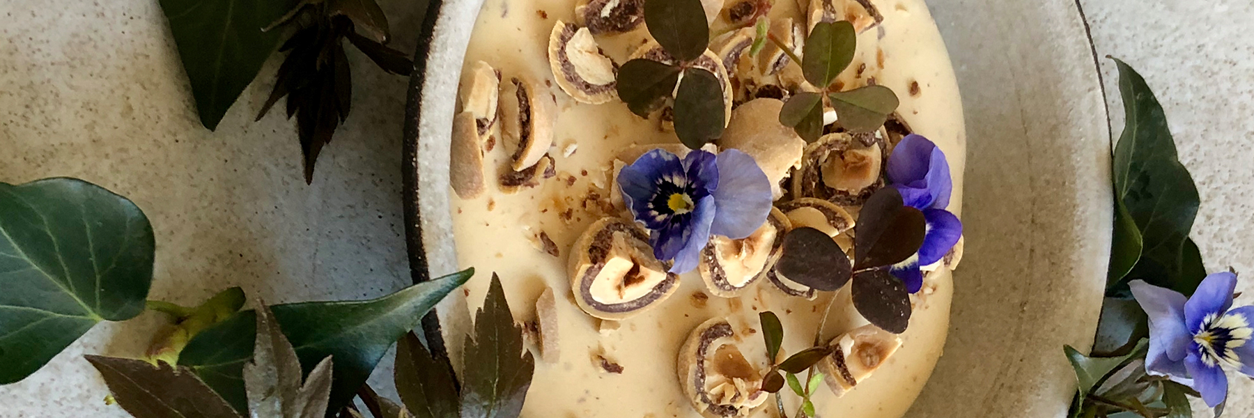 Tag isen ud af fryseren og stil den på køl i 10 minutter før servering. Lige inden servering drysses de resterende hakkede Amber hasselnødder over.