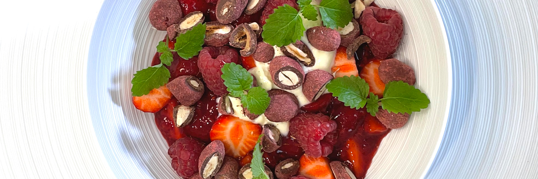 Vend ved servering friske kvartede jordbær samt hindbær i grøden. Den må gerne være tæt af bær - Gem lidt bær til pynt. Anret rødgrøden i 4 dybe tallerkner og kom en pæn skefuld af den hvide chokolade-flødeskum på toppen og pynt yderligere med en smule jordbær og hindbær. Drys lidt hakkede rødgrød drageé ud over og pynt evt. med lidt citron melisse.