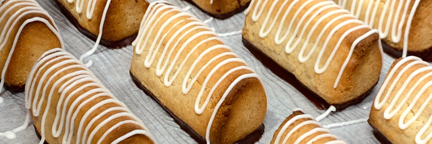 - Kom bagepapir på en bageplade og sprøjt kransekagen ud i 7. cm lange stykker.