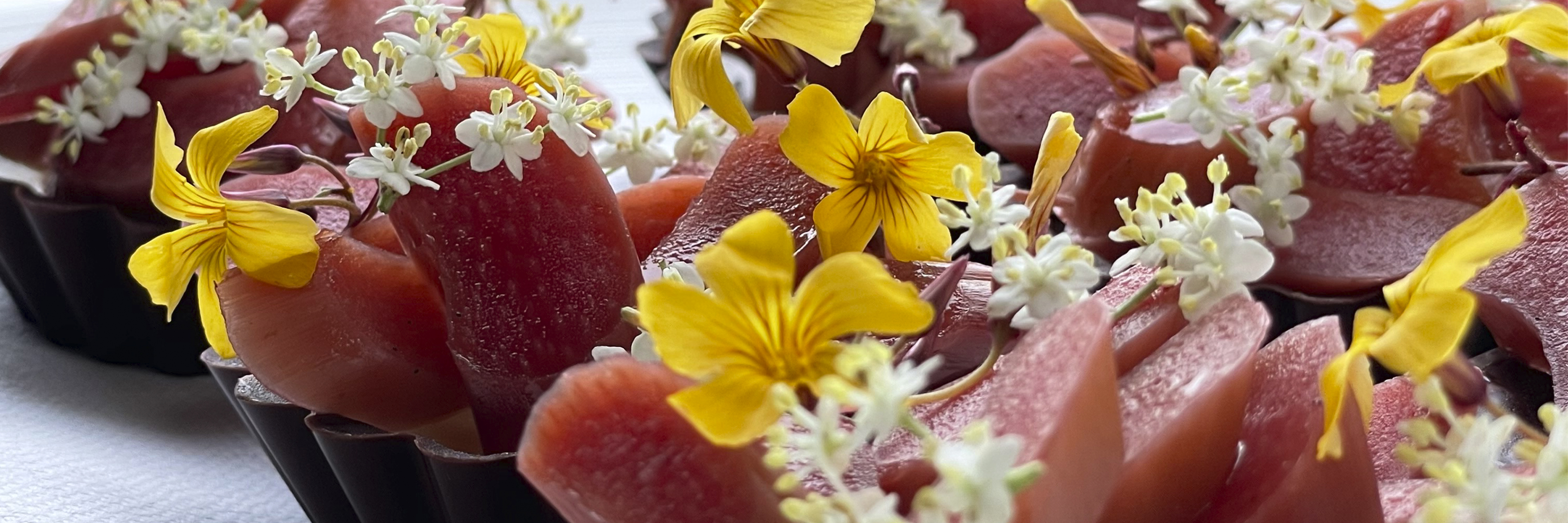Tærte på Amazonas 61% med hvid chokolade, hyldeblomst panna cotta & hyldeblomstsyltede rabarber