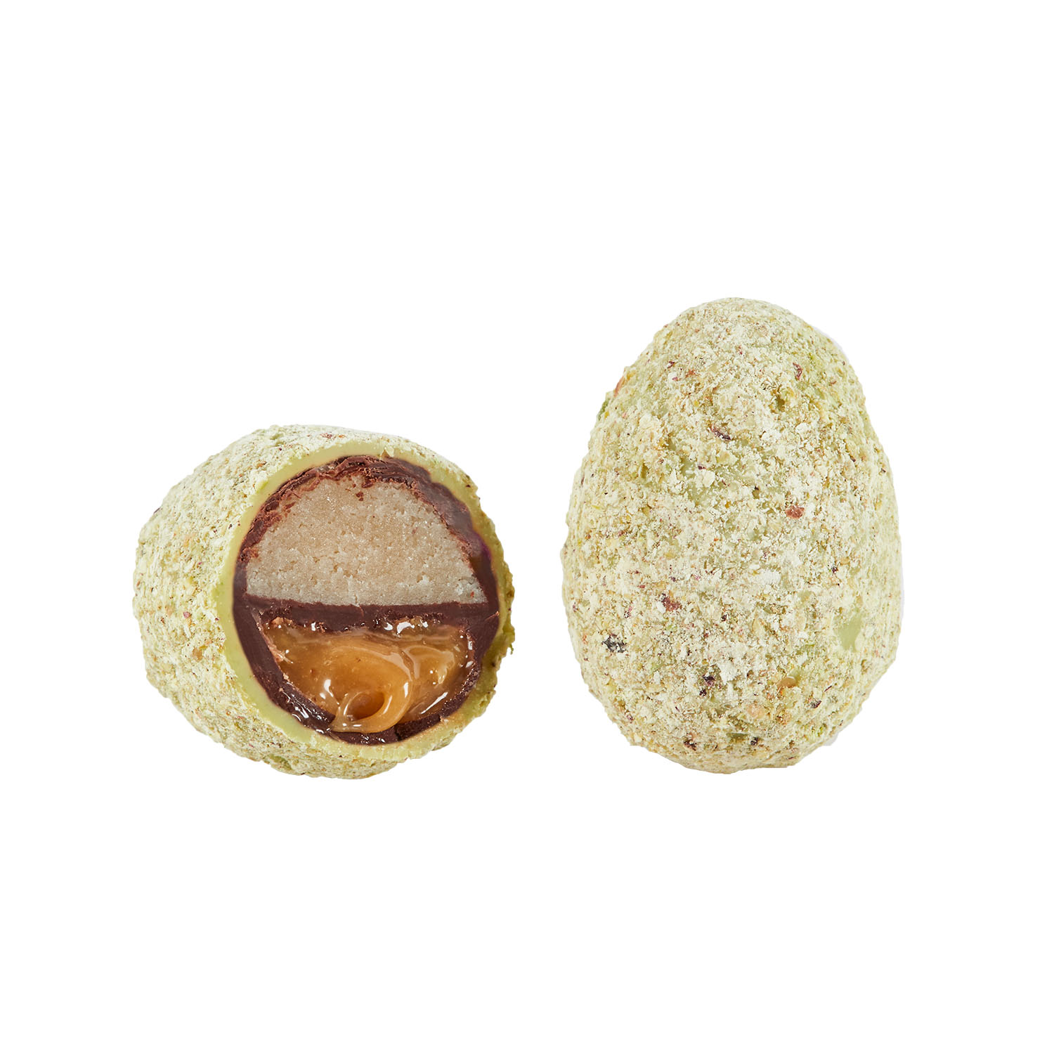 Mørk chokolade Amazonas 61%, hvid chokolade, marcipan af stenvalsede middelhavsmandler, pistacieganache, citron og revet pistacie