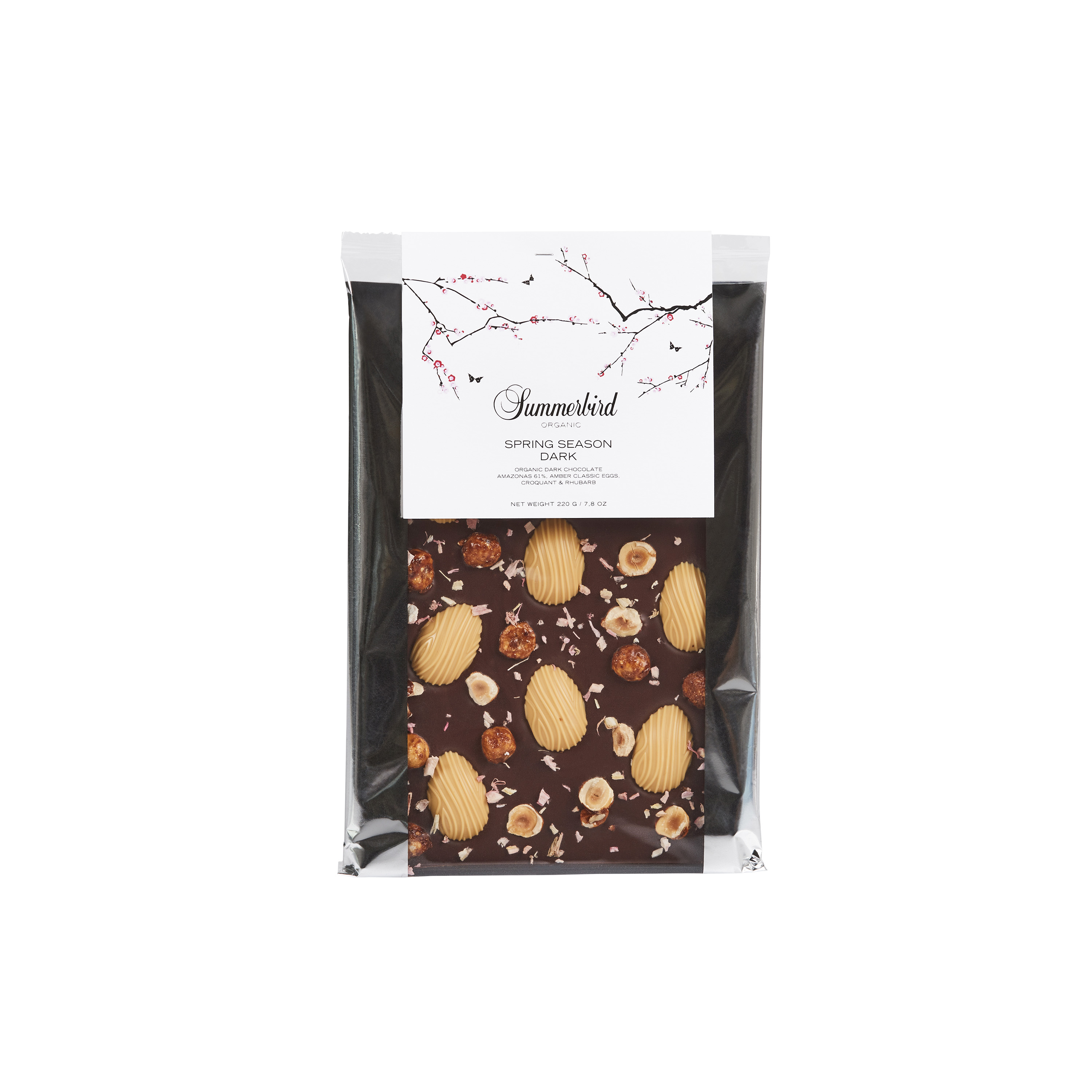 Vores mørke chokolade Amazonas 61% er i denne forårsudgave dekoreret med økologiske Amber Classic-chokoladeæg og drysset rundhåndet med krokant af Piemonte-hasselnødder og granuleret rabarber. Smagsprofilen er harmonisk, let ristet og krydret med frugtige noter, som leder tankerne hen på det dybe og eksotiske muscovadosukker.