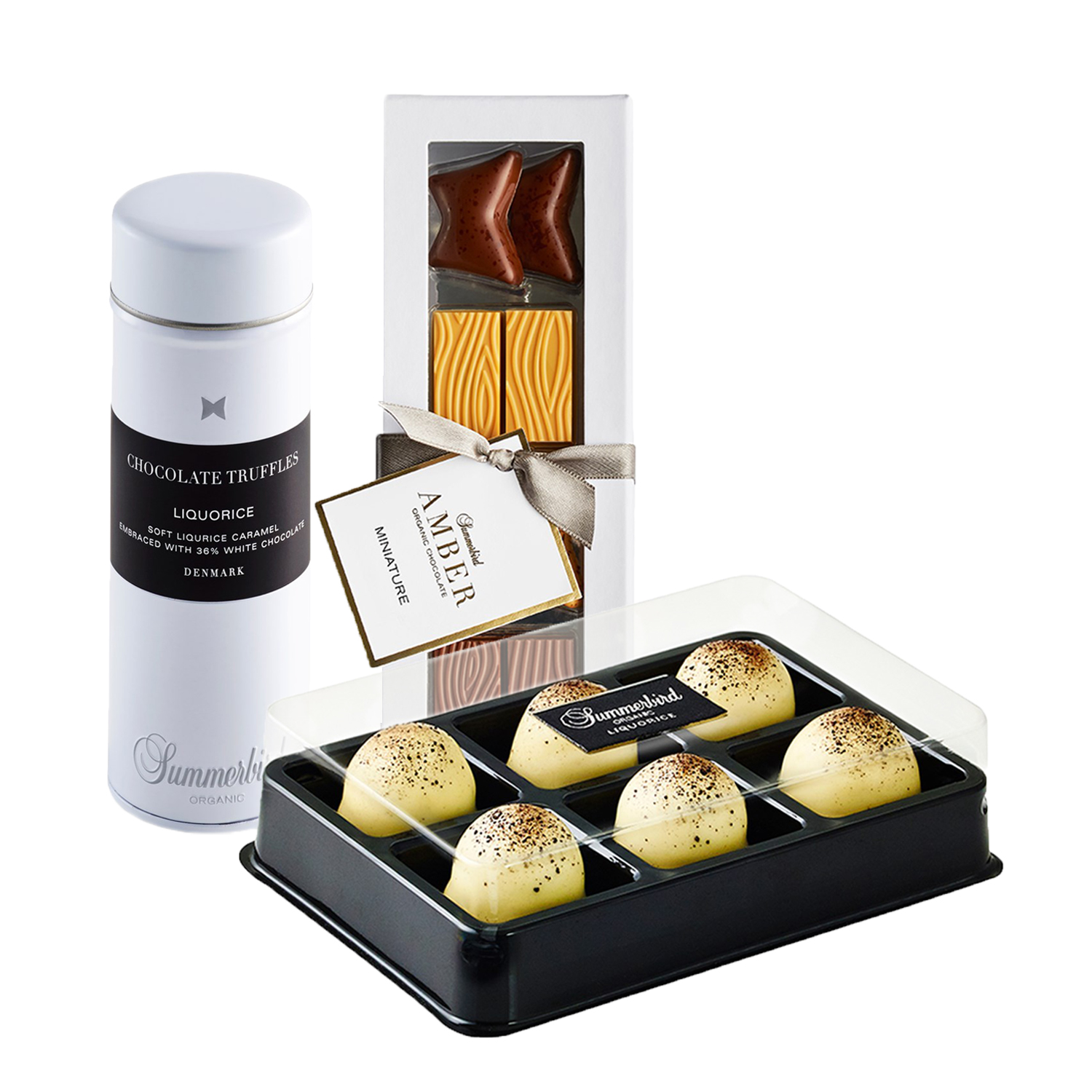 Amber Miniature-gaveæsken byder på en verden af velsmag i fire varianter. De små elegante stykker fyldte chokolader er alle omsluttet af vores forskellige Amber-varianter: Classic, Blond og Noir. Æsken byder på en verden af velsmag i form af f.eks. fleur d'orange praliné, vanilje, karamel, forfriskende mynte eller lakrids. Ganske enkelt den perfekte æske til dem, som sætter pris på harmoniske dekadente smagsoplevelser.