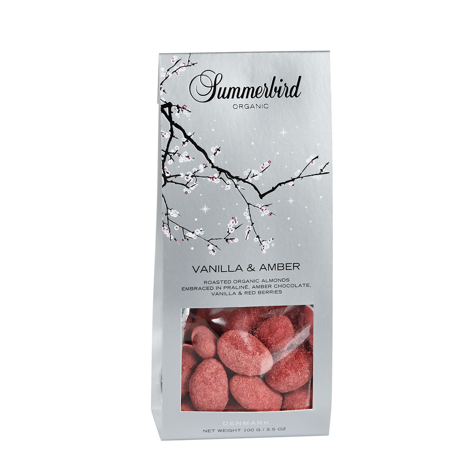 Let ristede spanske mandler drageret i praliné og krokant. Overtrukket med et tykt lag af vores prisvindende Amber Classic-chokolade og afslutningsvis vendt i det fineste pulver af røde bær og rigelige mængder vanilje. Harmoniske og unikke mandler med konsistens og frugtighed.