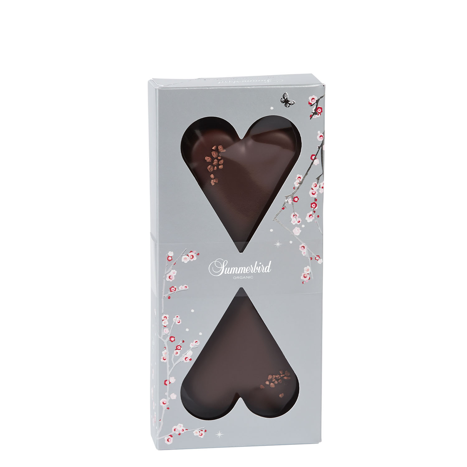 Marcipanhjerter af stenvalsede middelhavsmandler, overtrukket med et tykt lag mørk chokolade Amazonas 61 % og drysset med let ristede knuste kakaobønner fra kakaofrugten Arriba Nacional, der vokser langs Guayas-floden i Ecuador og anses for at være blandt de fineste i verden. Hjerter i perfekt balance skabt af kombinationen af den rene saftige marcipan og den frugtige mørke chokolade.